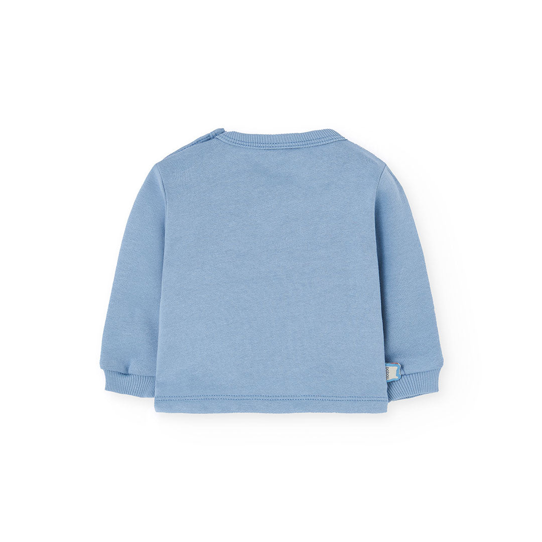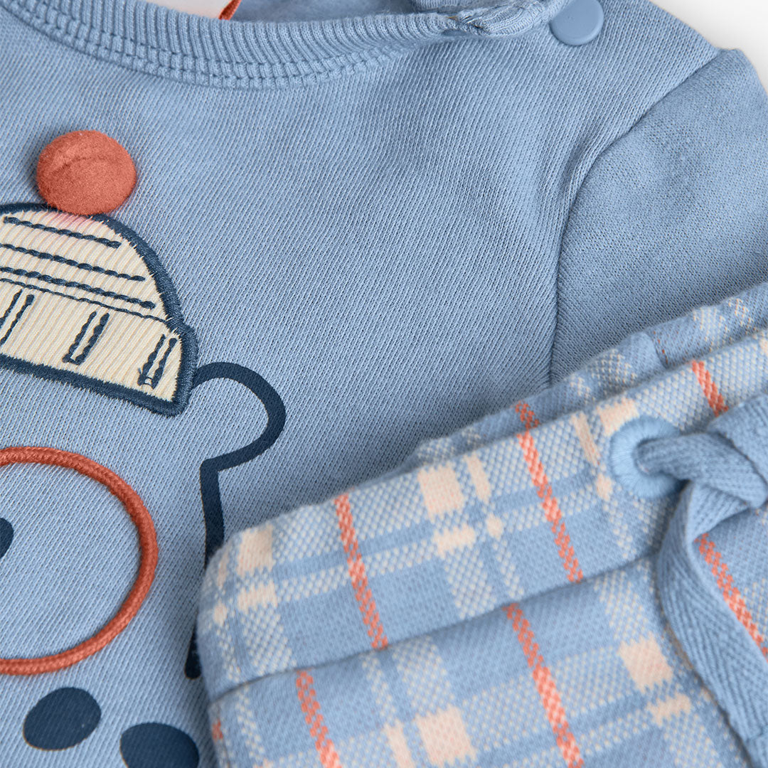 Conjunto de punto para bebé en color azul, con un diseño de animales y cuadros, ideal para la temporada de otoño e invierno.